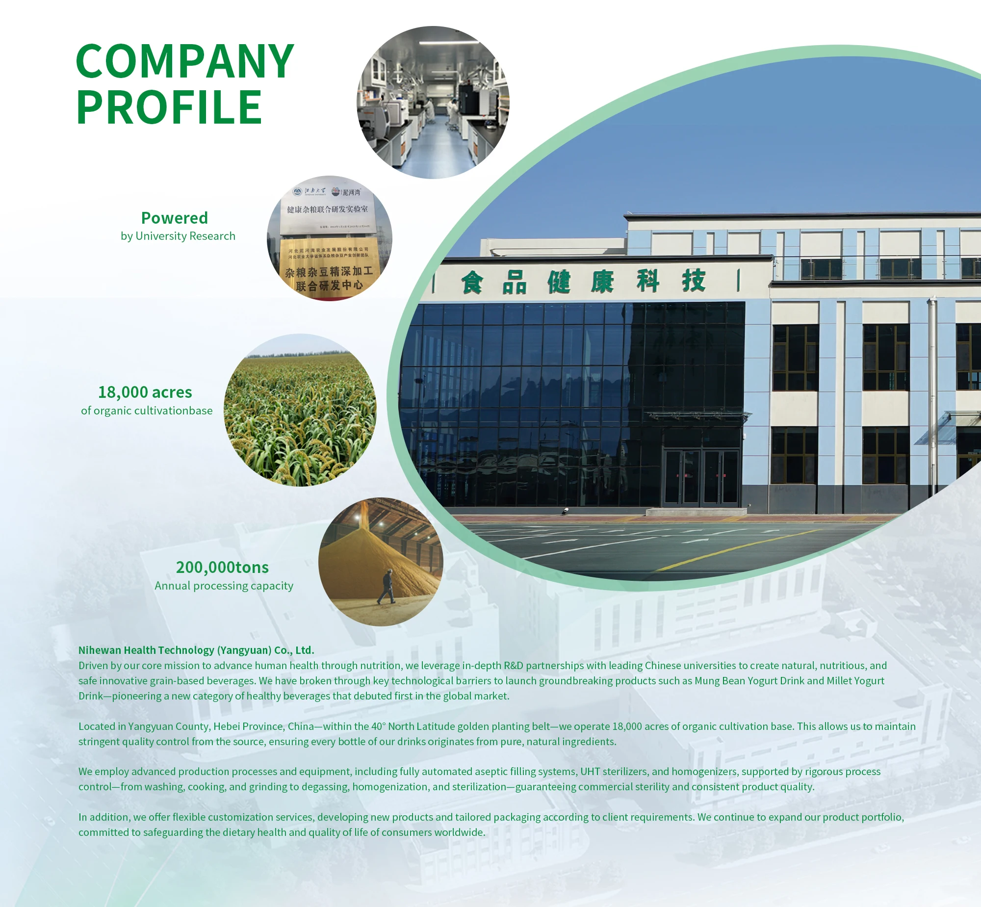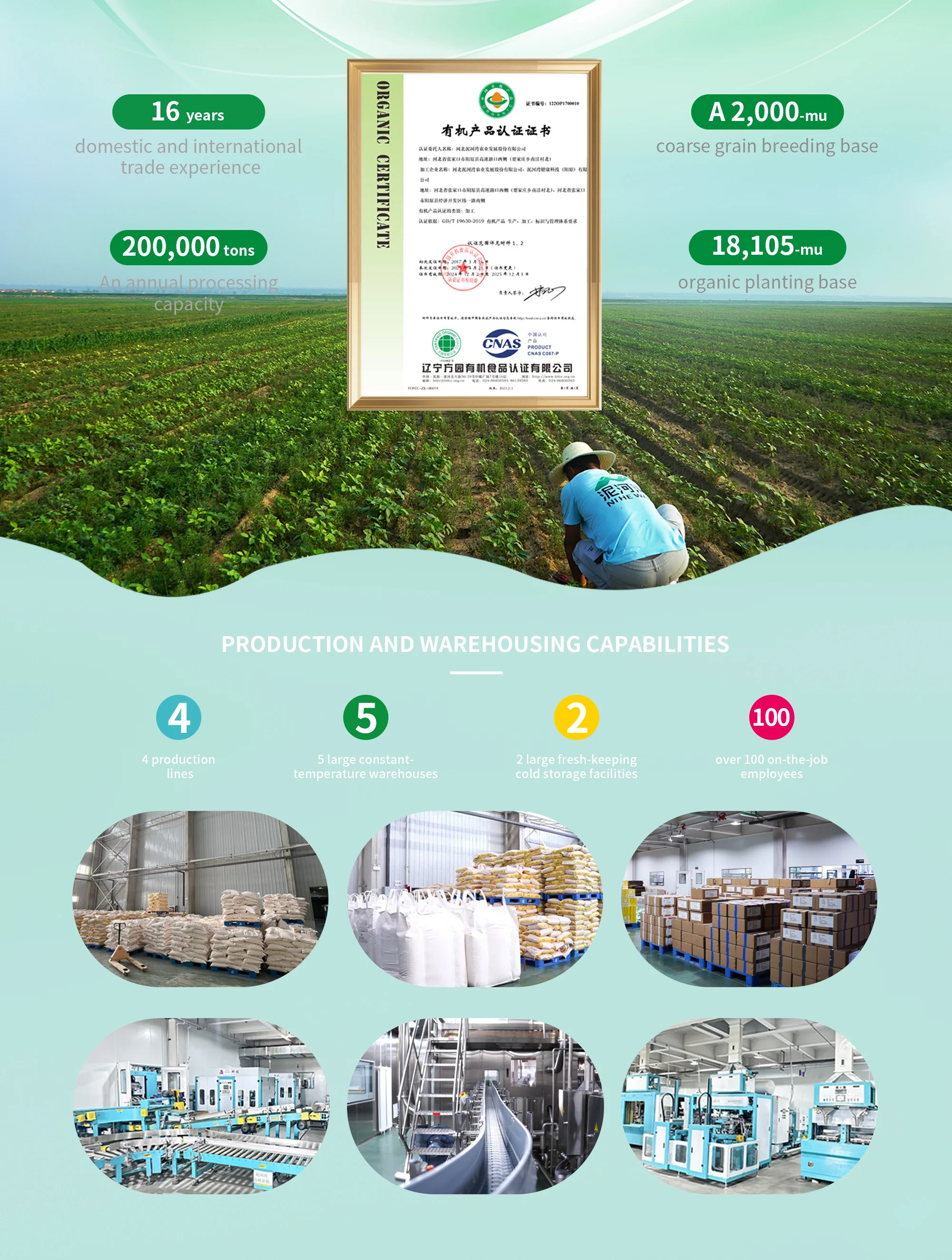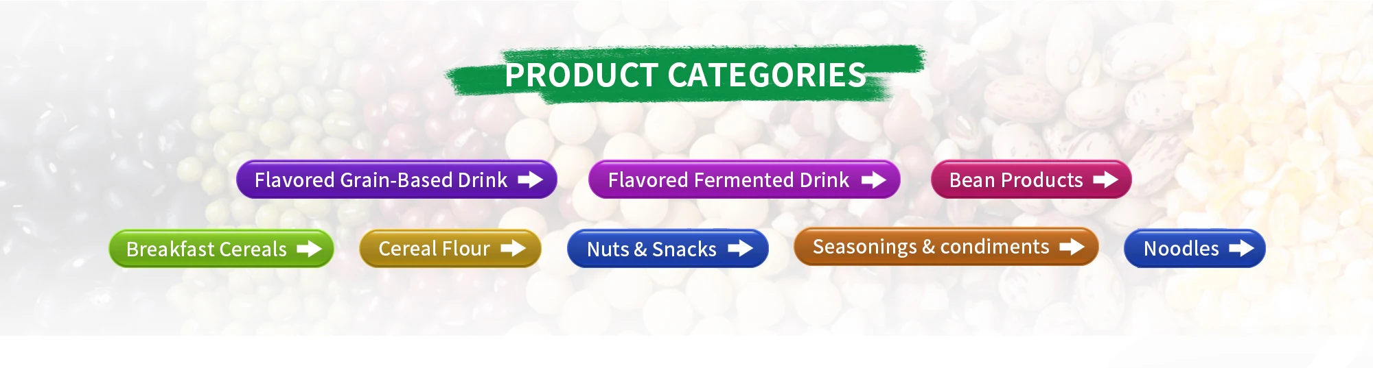 Productos principales:Yogur de frijol, harina de trigo sarraceno, copos de avena, mijo sin cáscara, Frijol mungo verde